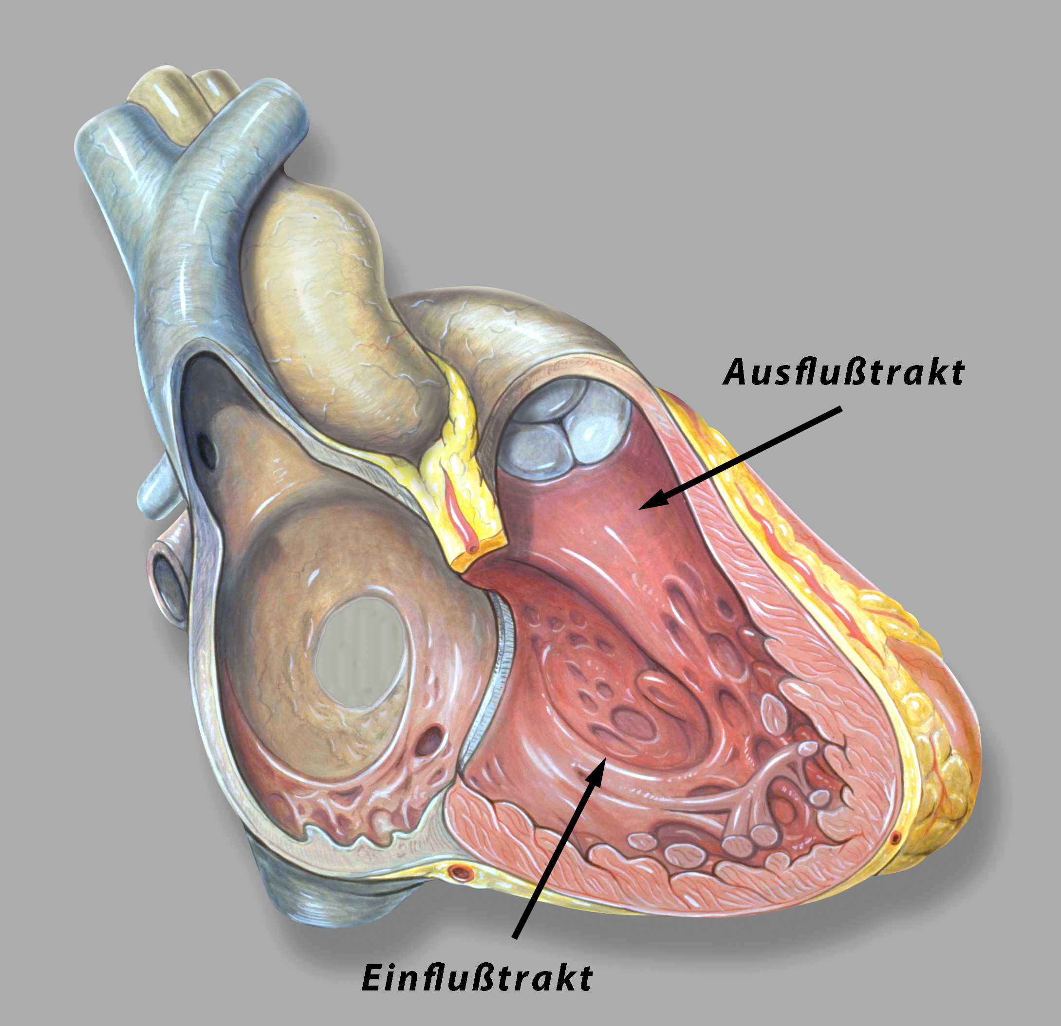 Gemäß dieses Blutstroms gibt es im rechten Ventrikel eine Einfluß- und eine Ausflußbahn oder, wie es Ärzte formulieren: Einen Einfluß- und einen Ausflußtrakt.