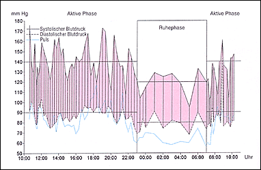 In regelmäßigen Abständen (tagsüber alle 15 Minuten, nachts alle 30 Minuten) wird die Blutdruckmanschette automatisch aufgeblasen und mißt den Blutdruck.