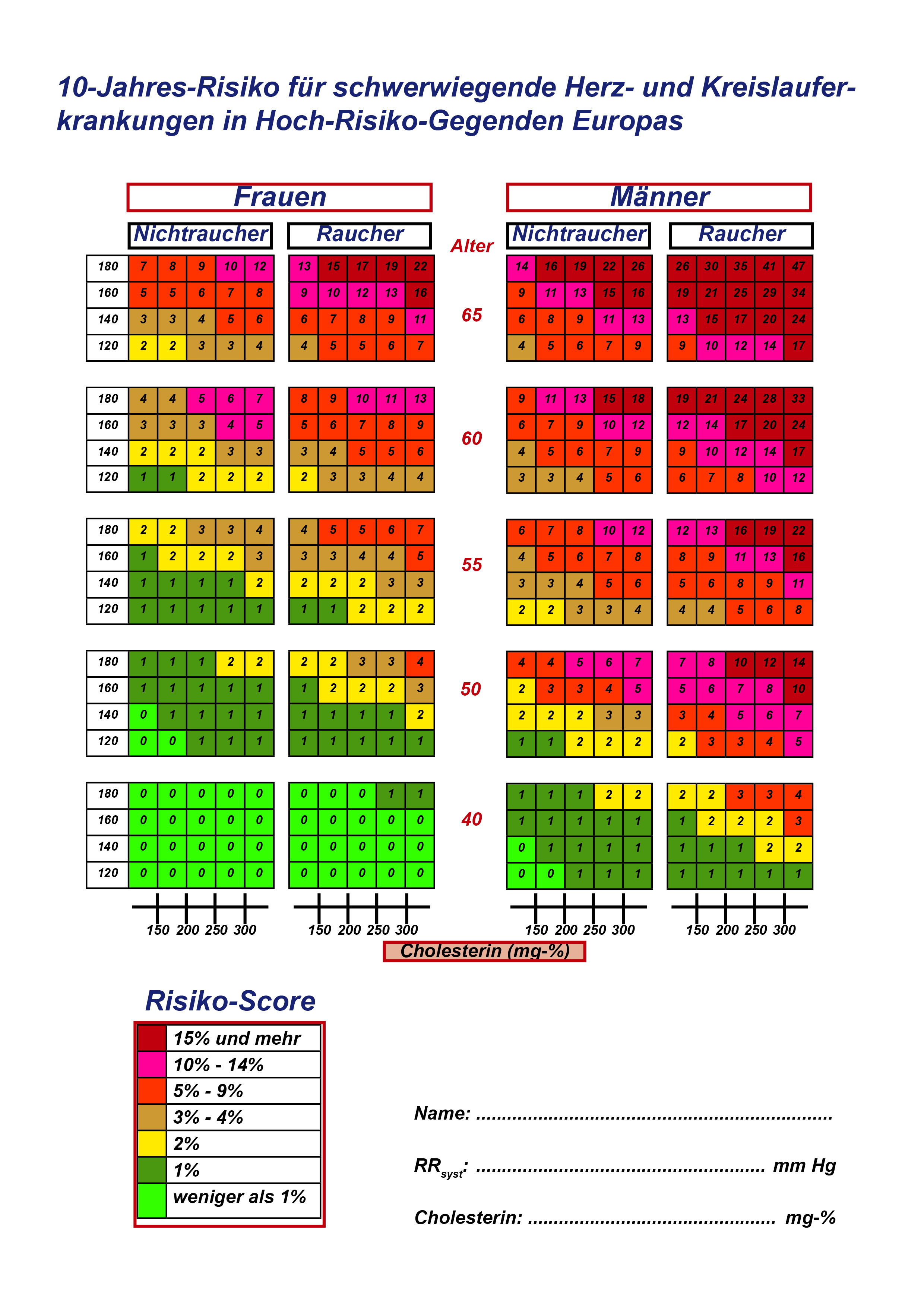 Bei den anderen oben genannten Risikobewertungen (PROCAM, FRAMINGHAM) ist dies nicht so einfach möglich. Hier gibt es aber entsprechende Rechner im Internet, in die man die einzelnen Risikofaktoren einträgt und die einem dann einen Wert anzeigen, der das Risiko des betreffenden Menschen ausdrückt.