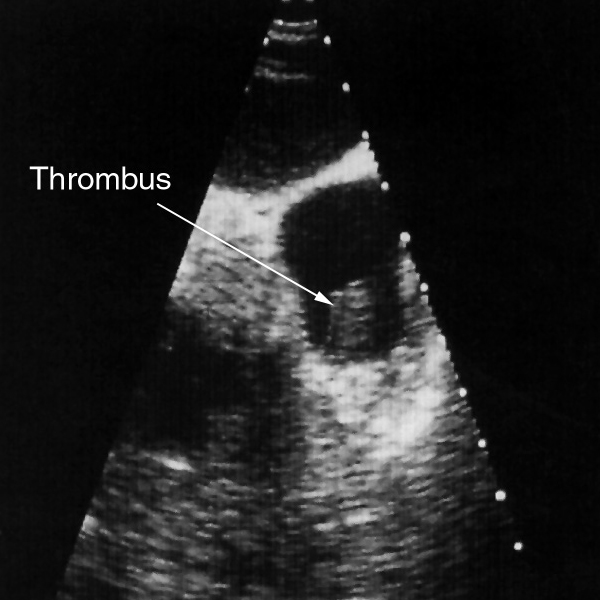Gerinnsel in den Herzvor- oder -hauptkammern (Abb. 7) oder Vergrößerung der verschiedenen Herzhöhlen (Abb. 8) finden.