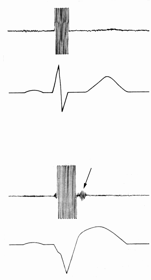 Der Kammerkomplex ist auch im hoch verstärkten EKG nicht verbreitert, nach dem Ende des QRS-Komplexes (rote Markierung in Abb. 2) sind keine zusätzlichen elektrischen Aktivitäten mehr zu sehen.
