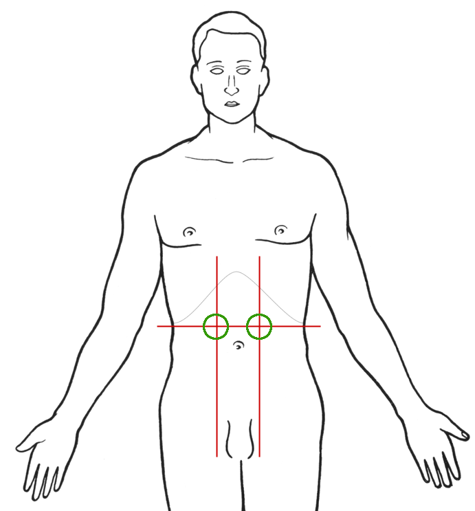 Man hört den Bauchraum etwa 2 cm oberhalb und 2 cm rechts und links des Bauchnabels (Abb. 39) und, wenn man hier etwas hört, auch über beiden Nieren im Rücken etwa 1 handbreit unter dem Rand der unteren Rippen ab. Benutzen Sie zum Abhören die Glocke des Stethoskopkopfes.
