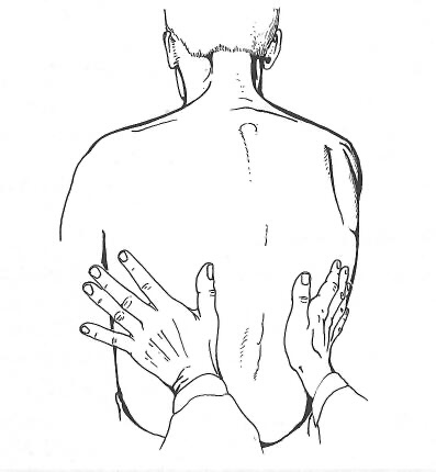 Man geht so vor, daß man den Brustkorb mit beiden Händen von beiden Seiten kräftig zusammendrückt. Im nächsten Schritt sollte man beim sitzenden Patienten mit der geschlossenen Faust kräftig auf die Wirbelsäule klopfen und dabei beobachten, ob und an welcher Stelle Schmerzen ausgelöst werden. Und schließlich sollte man den vorderen Brustkorb mit einem Finger punktförmig feste eindrücken, um ebenfalls evtl. Schmerzen auszulösen. Hierbei empfiehlt es sich, sowohl der Herzgegend, vor allem aber die Ansätze der Rippen am Brustbein rechts und links zu untersuchen. Die Ansätze der Rippen am Brustbein bestehen nämlich aus Knorpel und diese Stellen sind oft schmerzempfindlich. Hierdurch kann man erklären, warum diese Stellen bei bestimmten Bewegungen, beim Atmen, oft aber auch ohne auslösende Ursache spontan Schmerzen verursachen, die nichts mit dem Herzen zu tun haben.