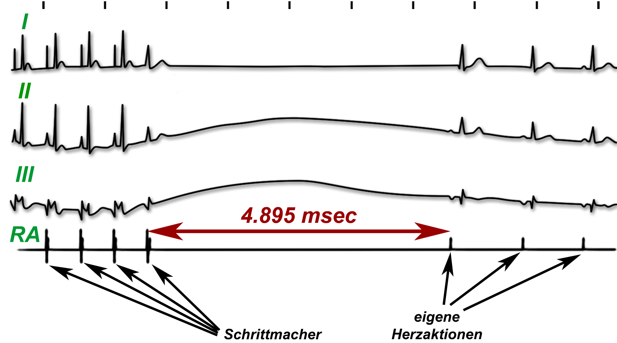 Hier beträgt die Zeit zwischen dem letzten Schrittmacherimpuls und der 1. Aktion des SInusknotens 4.895 msec, was eindeutig krankhaft ist. Korrigiert man diese Zeit um die Zeitdauer der letzten Herzschläge vor Einschalten des Schrittmacher (770 msec) kann man eine korrigierte Sinusknotenerholungszeit von 4.125 msec berechnen, was ebenfalls krankhaft verlängert ist. Dieser Patient hat also eine gestörte Sinusknotenfunktion, weshalb er in den vergangenen Monaten mehrfach kurz ohnmächtig geworden war. Das Syndrom des kranken Sinusknotens, unter dem er litt wurde durch die Einpflanzung eines Herzschrittmachers behandelt.
